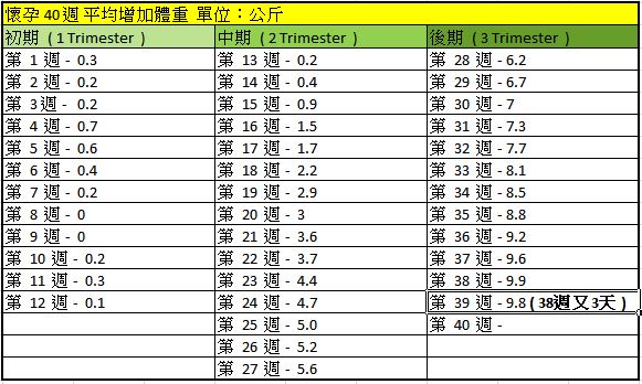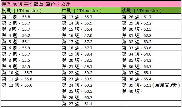 以上兩表格分別為紀錄「懷孕40週平均體重」及「懷孕40週平均增加體重」表,以方便清楚查看各週體重的確切數字及變化。